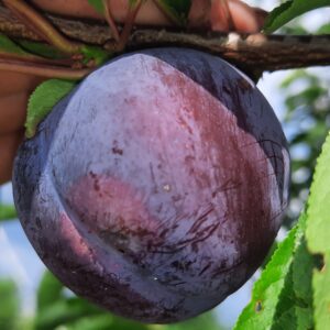 Новий сорт диплоїдної сливи! НОВИНКА КОЛЕКЦІЇ! Плоди дозрівають у першій половині серпня. Плоди дуже великі, округлі, масою 90-110 г, окремі плоди до 150 г. Зовні плоди темно-синього кольору, аж до майже чорного, покриті сизим нальотом. М’якуш жовтий, з елементами рожевого відтінку, дуже щільний, м’ясистий, соковитий. Відмінний збалансований кисло-солодкий смак. Товарність