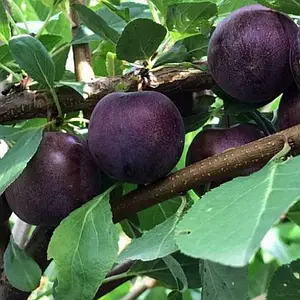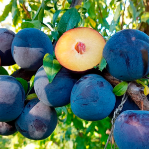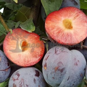 Новий сорт диплоїдної сливи! НОВИНКА КОЛЕКЦІЇ! Плоди дозрівають у першій половині серпня. Плоди дуже великі, округлі, масою 90-110 г, окремі плоди до 150 г. Зовні плоди темно-синього кольору, аж до майже чорного, покриті сизим нальотом. М’якуш жовтий, з елементами рожевого відтінку, дуже щільний, м’ясистий, соковитий. Відмінний збалансований кисло-солодкий смак. Товарність