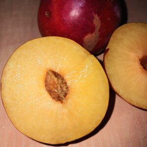 Представляємо новинку, складний гібрид “Персика” і “Сливи”, що має дуже незвичайний, вибуховий смак нагадує цукерки “дюшес”. М’якуш дуже ароматний з високим вмістом цукру. Плоди на вигляд дуже незвичайні плескаті, дозрівають нерівномірно, шкірка рожево-фіолетова на вигляд чимось схожі на інжирний нектарин. При перезріванні плоди стають ще солодшими і з багатим смаковим