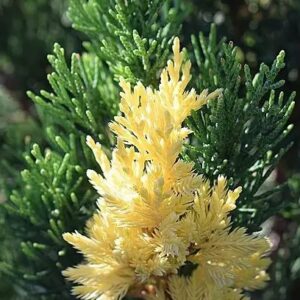 Ялівець середній Олд Голд – широкий розлогий кущ з невисокою кроною. Влітку має золотисто-жовте забарвлення, взимку ж його колір нагадує старе золото. Ця особливість вплинула на його назву: з анг. “old gold” дослівно перекладається як “старе золото”. Ялівець середній Олд Голд має повільну швидкість росту: приблизно 10 сантиметрів в ширину