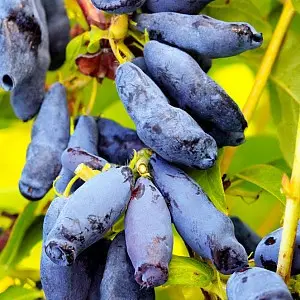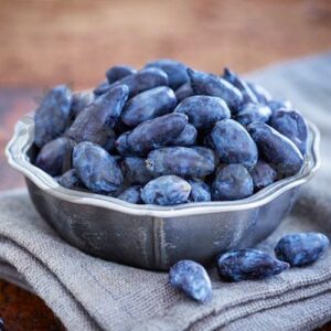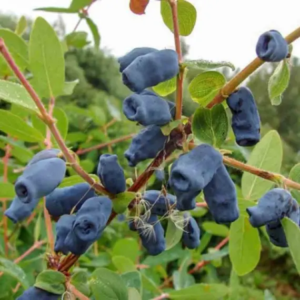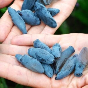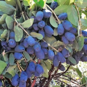 Жимолость Югана – один із найсмачніших сортів! Великі веретеноподібні, темно-фіолетового, майже чорного кольору із сильним нальотом ягоди кисло-солодкого, десертного смаку, дегустаційна оцінка 4,9 бала з 5! Дозрівають дружно вже в кінці травня – ранній сорт. Відриваються легко і майже не обсипаються. Щільна шкірка дозволяє добре переносити транспортування. Маса однієї ягоди жимолості